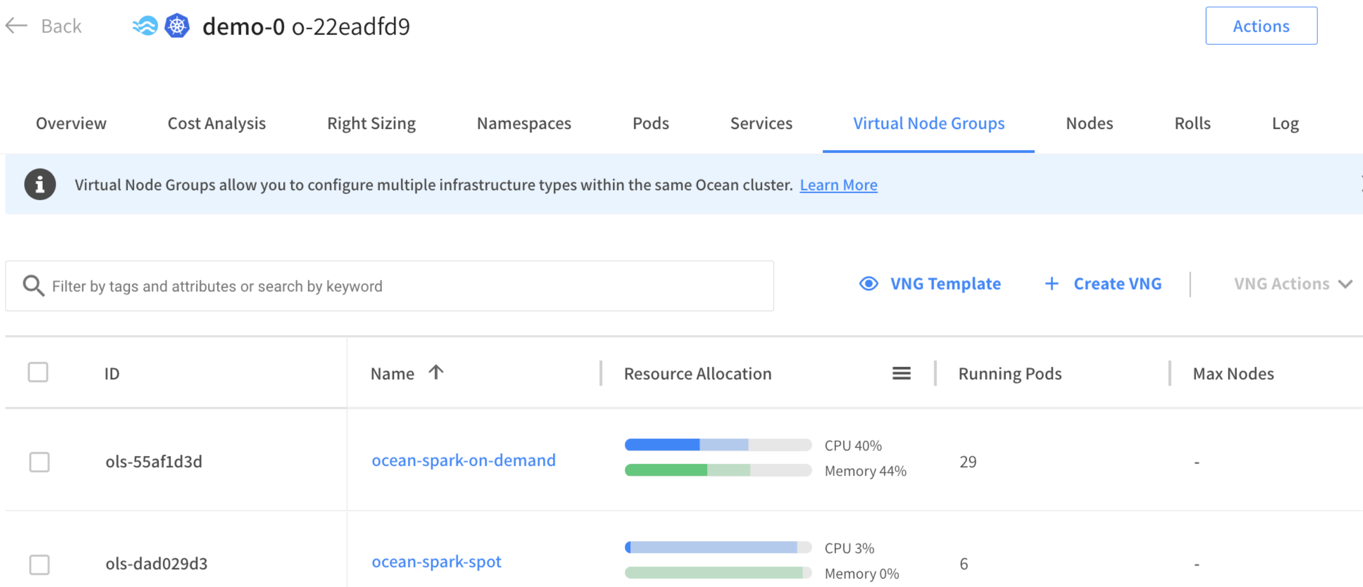 When you create an Ocean Spark cluster, two VNGs called ocean-spark-on-demand and ocean-spark-spot are automatically created. You can see them in the Ocean interface under the Virtual Node Groups tab.